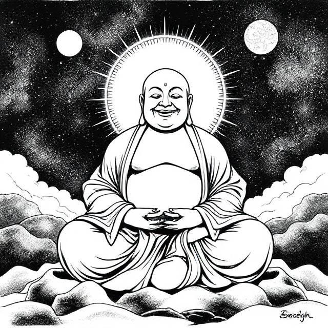 Sit like the Laughing Buddha looking out upon the universe. 坐對人間笑彌勒